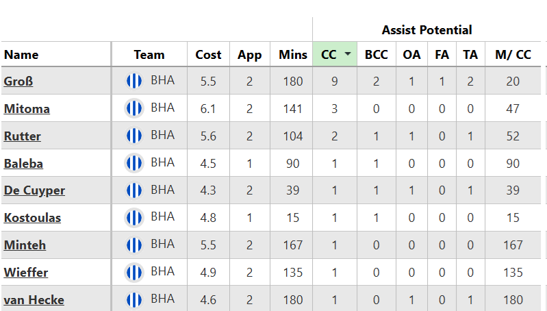 Above: Brighton players sorted by chances created (CC) over Gameweek 33