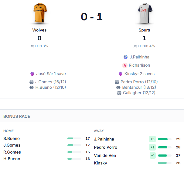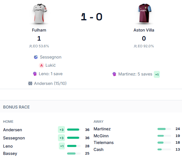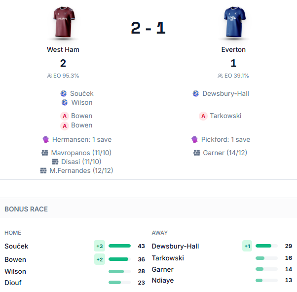 GAMEWEEK 34: SATURDAY’S GOALS, ASSISTS, DEFCON + PROJECTED BONUS POINTS