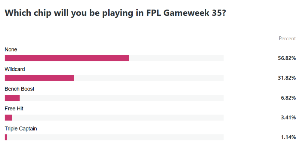 In our weekly user poll, over 30% of responders say they are planning to Wildcard in Gameweek 35. That makes it the most popular chip of the week, for those intending to use one.