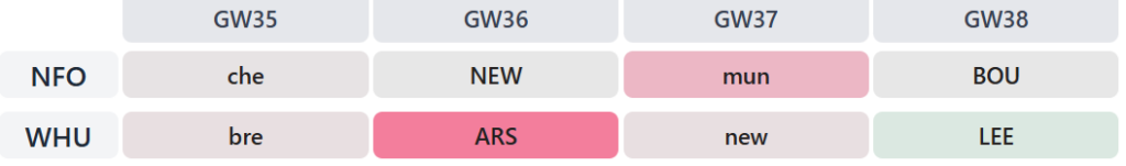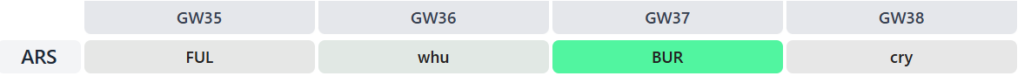 Speaking of whom, Rogers is in for the next two Gameweeks before being benched/shipped out (potentially for an Everton midfielder) in Gameweek 37/38. Eze’s inclusion is for an excellent-looking final four Gameweeks – if he’s fit, of course: