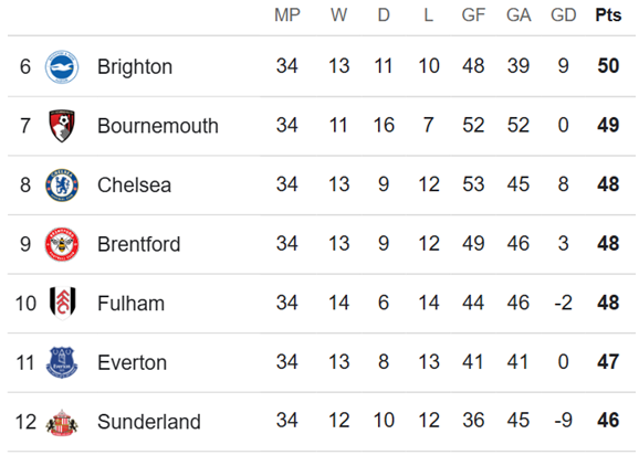 Sixth place could also mean Champions League qualification, depending on how Villa fare in the Europa League semis/final – more on that later.