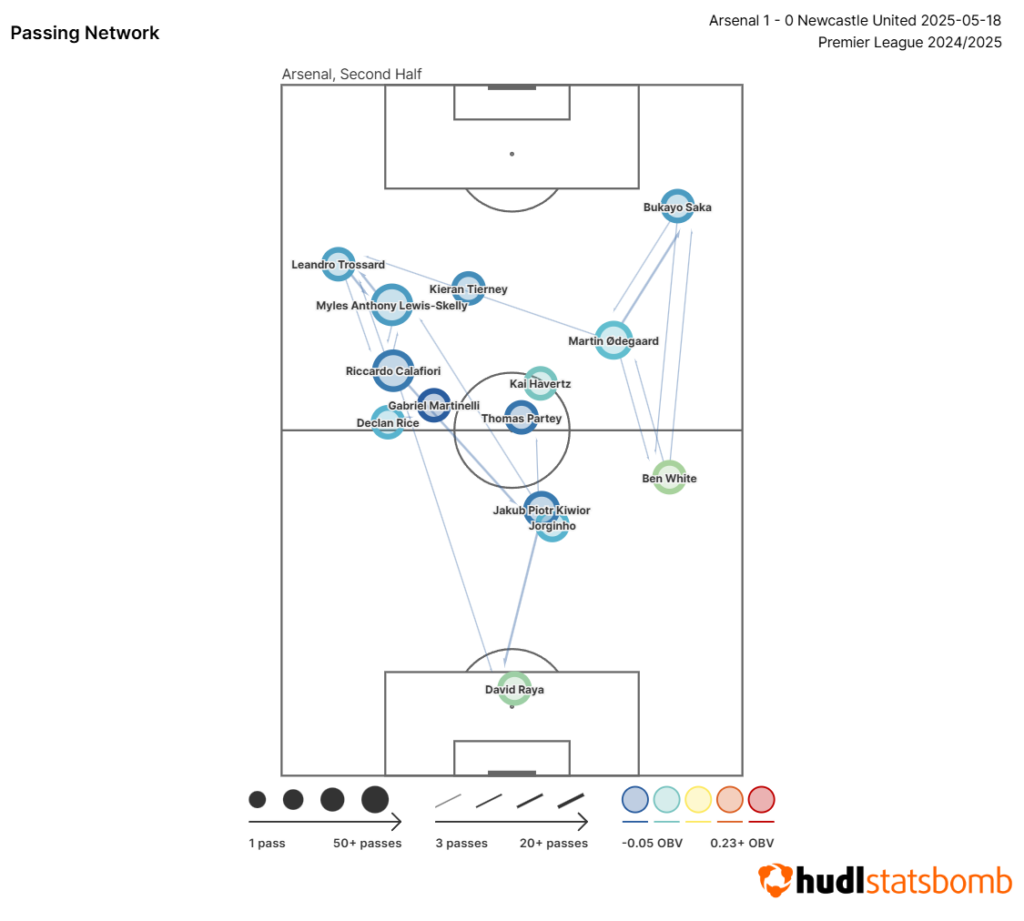 A bit of a muddle to the naked eye but essentially Kiwior holding fort, White a bit less attacking than he’d been in the first half and Calafiori doing his marauding thing that led to suitors courting his services after Euro 2024.