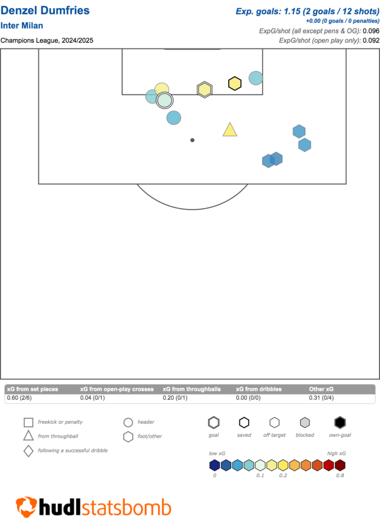 Fellow Inter wing-back Federico Dimarco (€5.5m) is a slightly cheaper alternative on the left flank. He racked up 25 shots and key passes in last season’s Champions League, four more than Dumfries.