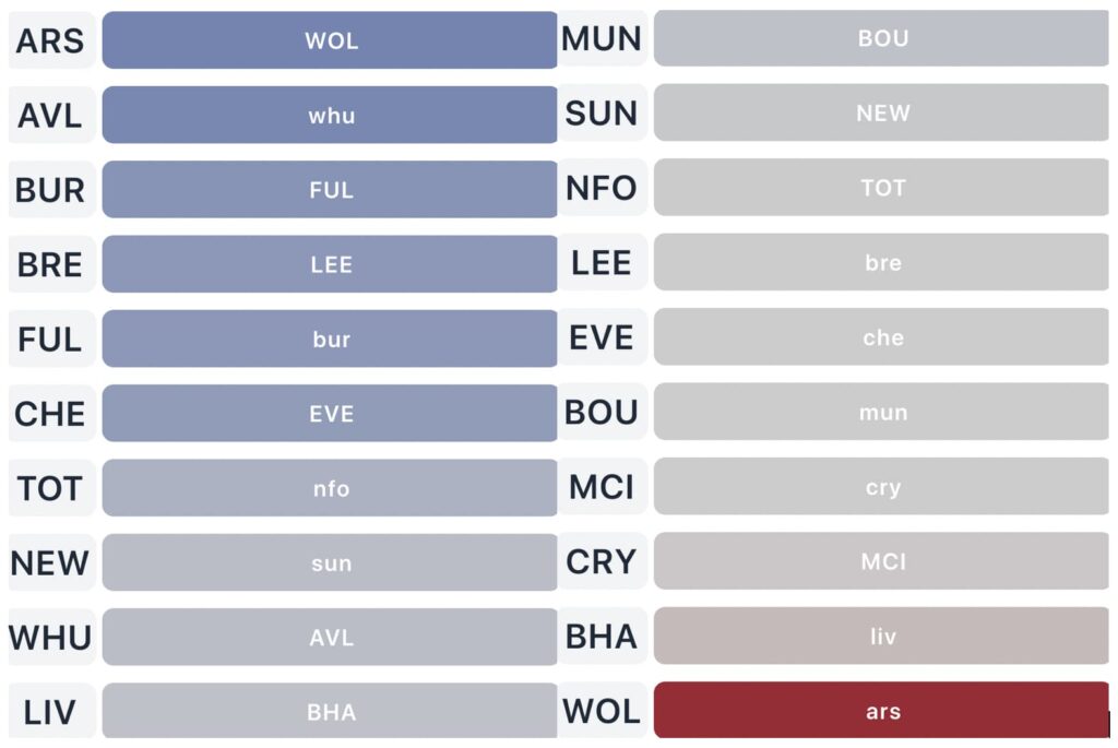 Above: The Gameweek 16 fixtures sorted by difficulty (easiest left, trickiest right) on our Fixture Ticker.