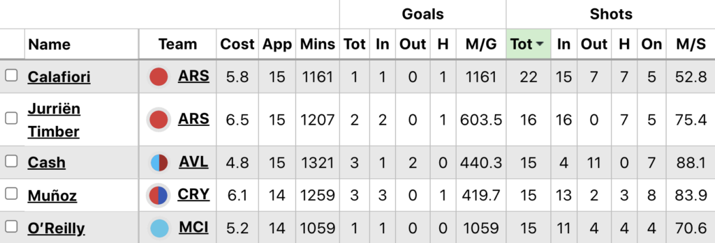We could perhaps consider Matty Cash (£4.8m) at the back. He’s already scored three times this season, the joint-most of any defender, and ranks joint-third in his position for shots (see image below). Aston Villa have conceded six goals in their last three away matches, mind.
