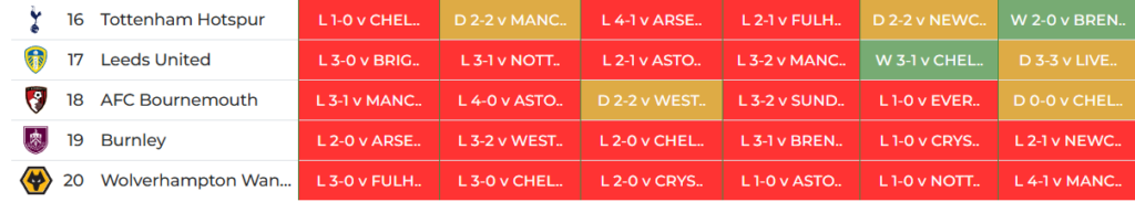 Above: The bottom five of the Premier League form table (last six matches), via Football Web Pages