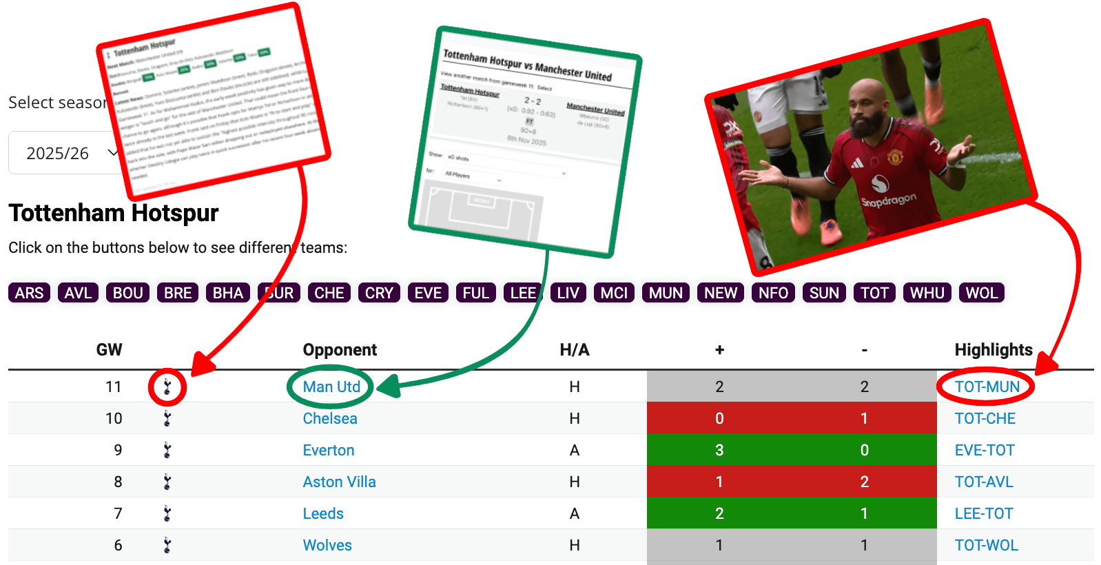 The table uses basic colour coding to make it easy to visualise periods of form. In addition to sorting by Gameweek, you can also sort by Opponent, Venue (H/A), Goals Scored (+) and Goals Conceded (-) to gain further insights.